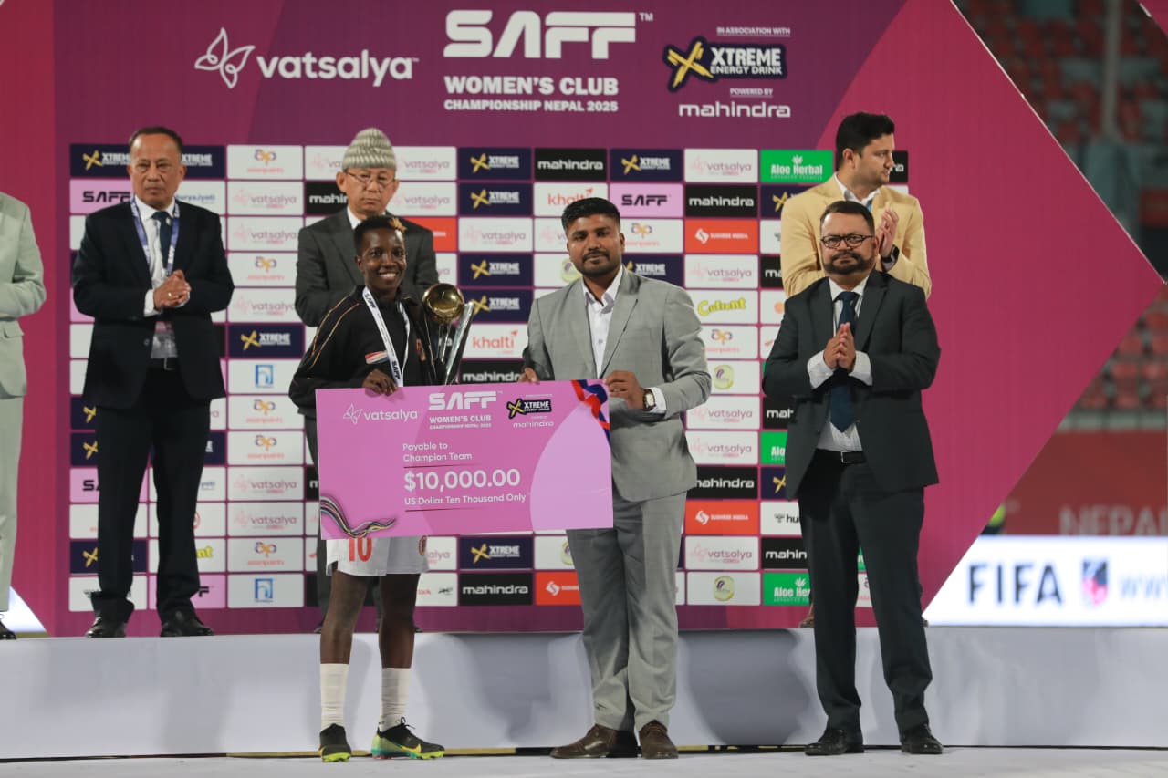 KATHMANDU - Once again, Dasharath Stadium proved unlucky for Nepal, as the dream of winning an international title at home slipped away. In the final of the first SAFF Womenâs Club Championship, Nepalâs APF Football Club lost 3â0 to Indiaâs East Bengal FC, leaving 8,000 home fans in shock. The crowd in Tripureshwor was buzzing before the match, but defensive mistakes decided the outcome. APF fought hard, but three key errors led directly to all three goals for the Indian team. Mistakes at the back hurt the home team. East Bengalâs top striker, Fazila Ikwaput, scored twice and won the Golden Boot. The first goal, in the 21st minute, came after a defensive error.  APF left-back Manmaya tried to clear a pass from East Bengalâs Sarita Yumnam with a header but missed. Fazila quickly took advantage, and her shot deflected off APF center-back Gita Rana, leaving the goalkeeper wrong-footed as the ball went in. In the 35th minute, things got even worse for APF. Manmaya again had trouble clearing a corner, and Indian defender Ashalata Devi took the ball from her, drove into the box, and crossed it. Midfielder Silky Devi Hemam jumped highest and headed the ball past APF goalkeeper Anjana Rana Magar, making it 2â0. A Nightmare Start to the Second Half. Any hopes of an APF comeback? The second half started badly for APF. Just 16 seconds after the break, any hope of a comeback disappeared. Goalkeeper Anjana Rana Magar let a weak shot from Fazila slip between her legs and into the net. That soft goal ended the contest, and East Bengal controlled the rest of the match. They swept the individual honors as well.  **Champions: East Bengal FC (Received $10,000 USD)** **Runner-up: APF Football Club (Received $5,000 USD)** Striker Fazila Ikwaput was the undisputed star of the tournament. With nine goals in just five matches, Striker Fazila Ikwaput stood out as the tournamentâs top player. She scored nine goals in 5 games, earning both the Most Valuable Player (MVP) and Top Scorer awards, along with an additional $1,000 USD and her trophies. Additionally, East Bengalâs Elangbam Panthoi Chanu was judged the Best Goalkeeper, completing a total dominance by the visitors. Transport United FC took home the Fair Play Award. For APF and their fans, it was a tough loss. They reached another final but missed out on the trophy again, learning another hard lesson on the big stage.