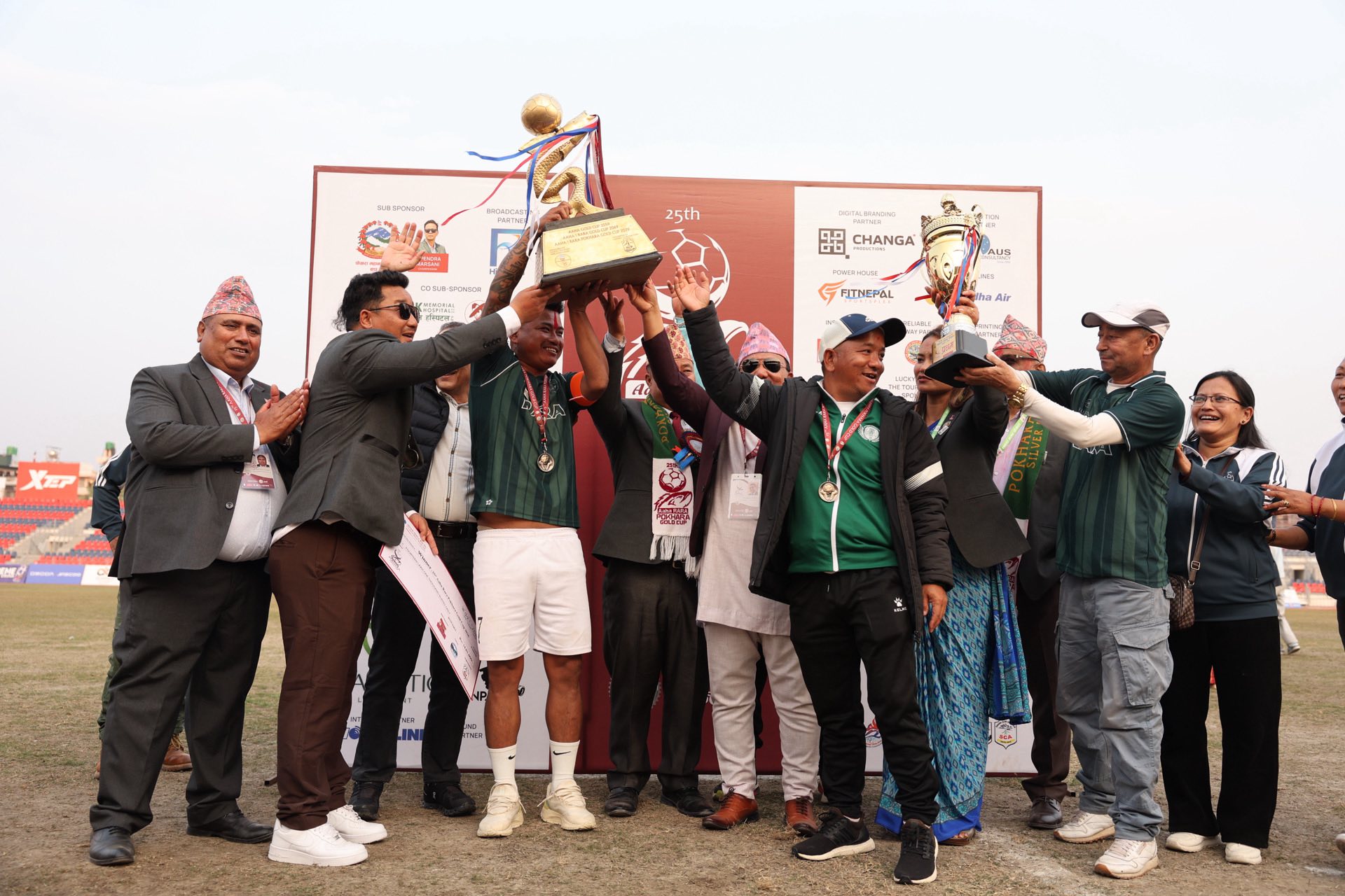 POKHARA – In a historic moment for the Lake City, host Sahara Club Pokhara ended a 12-year title drought by clinching the 25th Aaha! Rara Pokhara Gold Cup with a decisive 2-0 victory over Jawalakhel Youth Club. Playing at the Pokhara Stadium on Saturday, the hosts showcased clinical efficiency to claim their first trophy since 2013 (2070 BS). The breakthrough came in the 25th minute when Mukunda Niure found the back of the net, handing Sahara an early momentum that they never relinquished. The victory was effectively sealed in the 73rd minute when Taye Daniel doubled the lead, leaving the top-tier Jawalakhel side with no way back into the contest.  This edition carried special significance as the "Silver Jubilee" of the tournament, marking 25 years since its inception. While the organisers had initially intended to host the tournament under floodlights, technical difficulties after the opening match forced the schedule back to daytime fixtures; however, the shift did little to deter the passionate home crowd. As the winners of this milestone edition, Sahara Club Pokhara walked away with a purse of NPR 1.4 million, while runners-up Jawalakhel Youth Club received NPR 701,000. The tournament, which featured 12 competing teams and began on Magh 27, concludes not just as a sporting success but as a monumental homecoming for a club that remains a cornerstone of Nepali football culture.