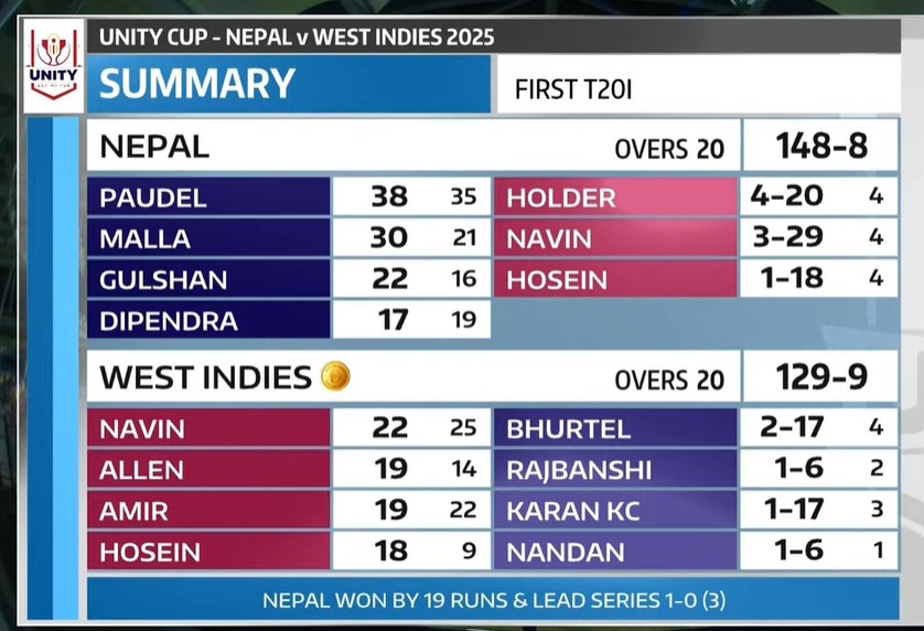 Sharjah – Nepal etched its name in cricket history on Saturday, registering a landmark 19-run victory over two-time T20 World Cup champions West Indies in the first match of their three-match T20I series. The win not only handed Nepal a 1-0 lead in the series but also marked their first-ever triumph over a full-member nation in international cricket. Set a target of 149, the West Indies faltered against Nepal's disciplined bowling attack, finishing on 129 for 9 in 20 overs. Despite being favourites, the Caribbean side never found momentum, with Amir Jango (19) and Navin Bidaisee (22) top-scoring in a modest chase. Nepal struck early when opener Kyle Mayers was run out for five by a sharp direct hit from Kushal Bhurtel in the second over. Soon after, Nandan Yadav removed Kalim Aguste (15), and wickets continued to tumble at regular intervals. By the 17th over, West Indies were reeling at 94 for 7, leaving skipper Akeal Hosein and Fabian Allen as their final hopes. The equation boiled down to 49 runs required from the last 18 balls. While Allen threatened briefly, Nepal's bowlers held their nerve. Karan KC, entrusted with the 19th over, sealed the contest with a brilliant spell that cost just two runs, putting the result beyond doubt.