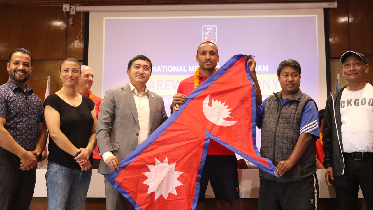 The All Nepal Football Association (ANFA) officially bid farewell to the Nepal National Football Team on Monday as the squad prepares to travel to Vietnam for the third round of the AFC Asian Cup Qualifiers. The farewell ceremony was held at ANFA headquarters in Satdobato, Lalitpur. The event was graced by the Member Secretary of the National Sports Council (NSC), Tanka Lal Ghising, as the chief guest. Acting ANFA General Secretary Damodar Bhattarai (Badri), along with central members Purushottam Thapa and Sarila Shrestha, extended their best wishes to the team before departure. Nepal, placed in Group F, is scheduled to play two legs against Vietnam on October 9 and 14. Initially, the second leg was slated to be held in Kathmandu; however, the AFC declared the Dasharath Stadium unfit due to infrastructure deficiencies and safety concerns — forcing Nepal to surrender its home advantage.