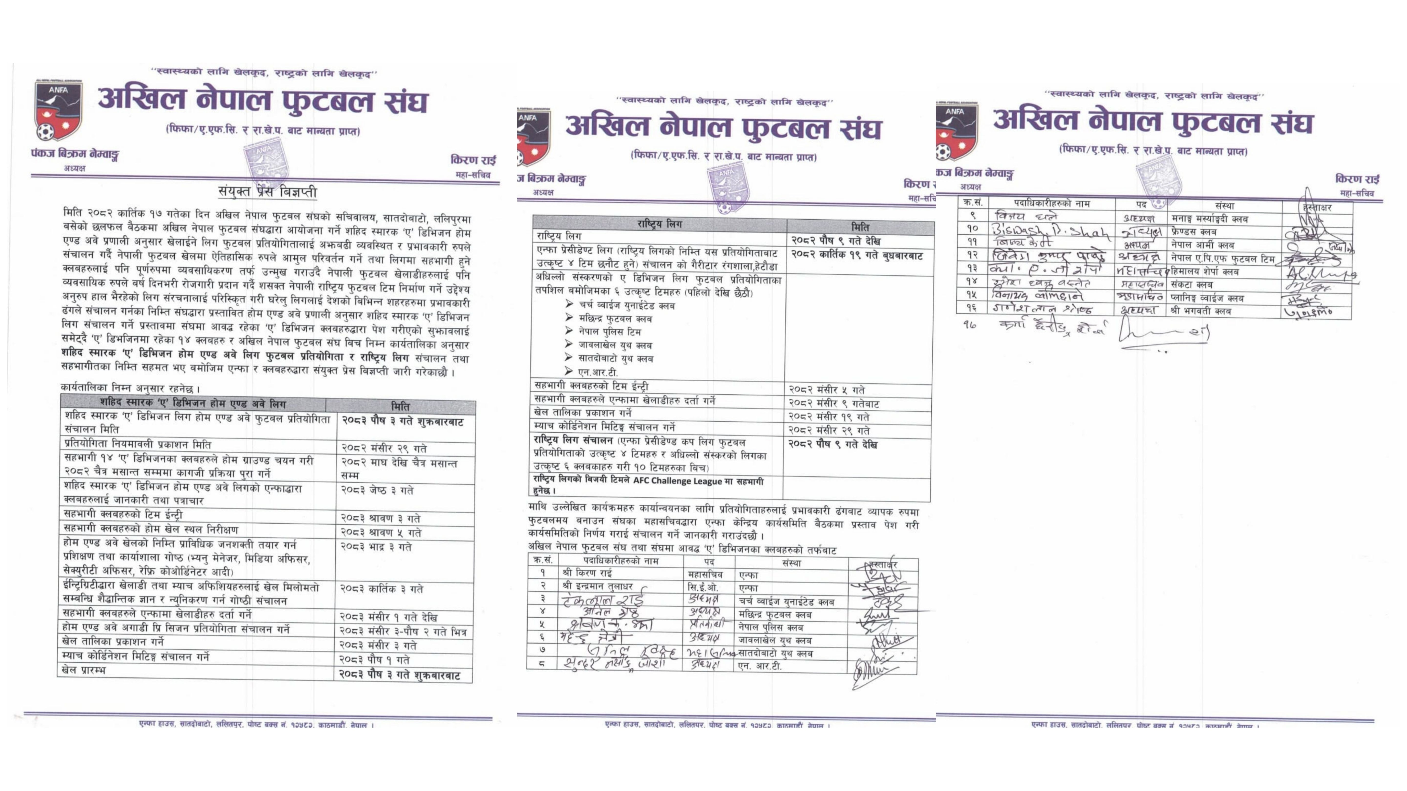 Clubs now have a tight window to prepare for the season: November 21 (Mangsir 5): Deadline for participating clubs to submit their team registration. November 25 (Mangsir 9): Final deadline for player registration. December 5 (Mangsir 19): The official fixture schedule will be released. In a move to calm stakeholders, ANFA also confirmed that the Martyr's Memorial 'A' Division League will be restored to its traditional format for its subsequent edition, beginning in mid-December 2026 ( 2083).