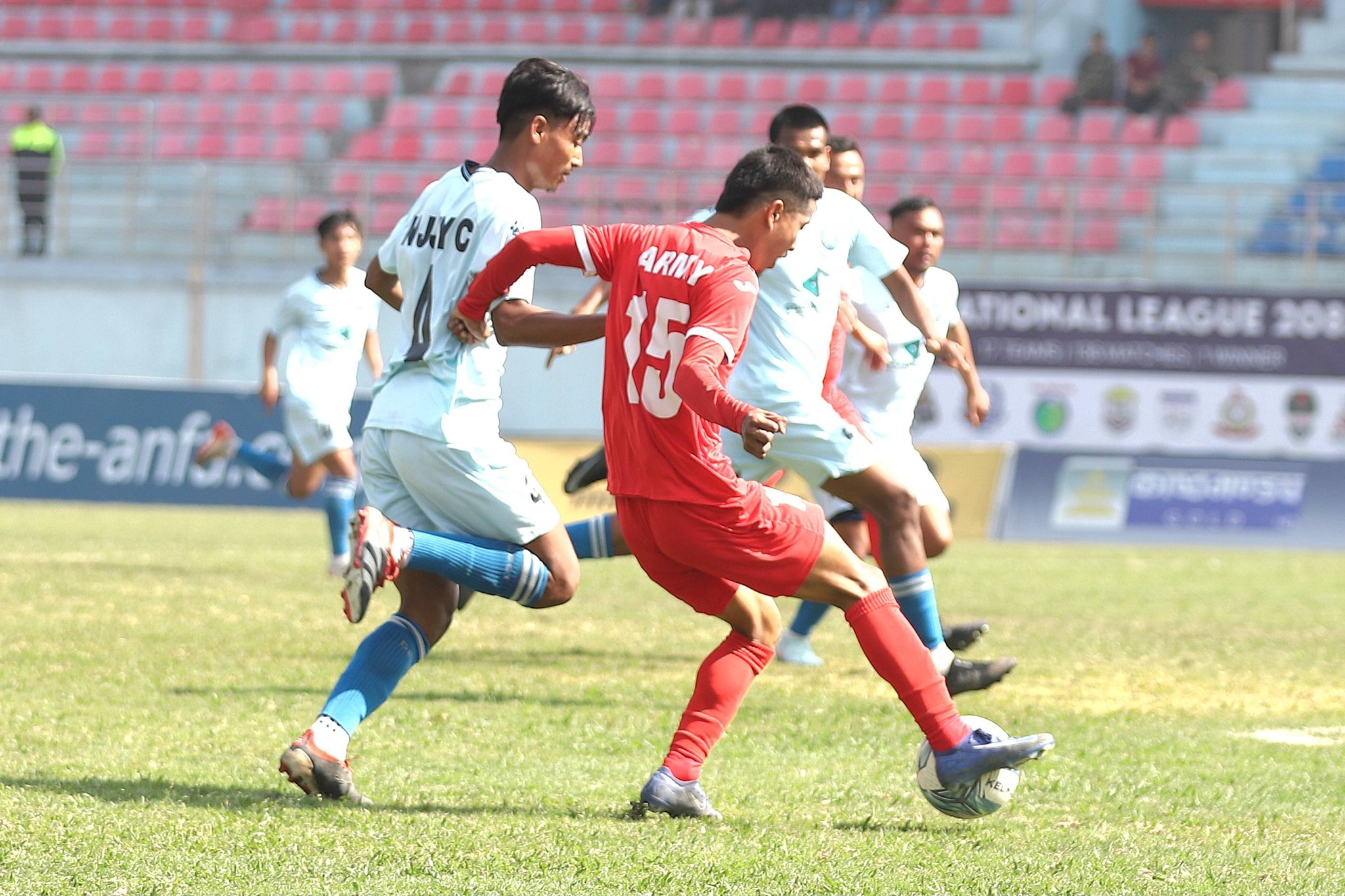 KATHMANDU – Dasharath Stadium hosted a high-stakes triple-header today. The matches featured clinical finishing, tactical discipline, and a frustrating stalemate for the league's heavyweights. Tribhuvan Army Club (TAC) and New Road Team (NRT) solidified their positions near the summit. Meanwhile, Manang Marshyangdi Club (MMC) ended the evening rueing missed opportunities. **Army March Past Struggling Nava Janajagriti** Tribhuvan Army Club opened with an efficient 3-0 win over struggling Nava Janajagriti Youth Club. The "Armymen" wasted no time asserting dominance—George Prince Karki broke through the defense and scored in the 9th minute to set the tone. The Army’s constant high pressure forced a turnover, allowing Nawayug Shrestha to double the lead in the 54th minute. Kunsang Lama struck in the 76th minute to seal the win, ensuring Army moves to 17 points from eight matches. Nava Janajagriti, still winless after eight straight losses, remain at the bottom of the table without a single point.  **NRT Overcomes Own-Goal Setback to Edge Chitlang FC** New Road Team (NRT) secured a crucial 2-1 win over Chitlang FC, though not without challenge. NRT took the lead in the 10th minute through Rajiv Lopchan, marking the game's first breakthrough. The match turned in the 37th minute when Sanam Sodemba Limbu's own goal brought Chitlang level. In the second half, NRT regained control: Timothy Chiemerie Okereke's precise strike in the 54th minute restored their advantage. This victory, their fifth, lifts NRT to 19 points from nine matches, while Chitlang stays in the lower half with 7 points.  **Stalemate at the Summit: Manang and Planning Boys Share Spoils** The floodlit finale failed to produce the goals fans expected, as Manang Marshyangdi Club and Planning Boys United played out a tactical 0-0 draw. Despite both sides creating half-chances, the defensive lines stayed organised for the full 90 minutes, with Manang’s best opportunity coming from a set-piece in the 65th minute, denied by the Planning Boys’ goalkeeper. For Manang, the draw feels like two points dropped in the title race. Planning Boys will likely view the clean sheet against MMC as a hard-earned tactical victory, having withstood late pressure. Both sides walked away with a point, keeping the mid-table battle tightly contested as the league heads into its next phase.